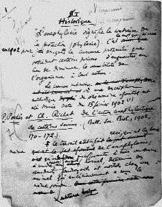 Le 15 février 1902, ils publient à la Société de biologie sur le même toxique. Le titre De l'action anaphylactique de certains venins, ne relie pas cette note à la précédente. Le travail ne porte plus sur l'empoissonnement lui-même mais sur la réponse inattendue, à l'injection de venin. La première phrase le précise ; « Nous appelons anaphylactique (contraire à la phylaxie) la propriété dont est doué un venin de diminuer au lieu de renforcer l'immunité quand il est injecté à dose non mortelle. Il est possible que beaucoup de venins (ou de toxines) soient dans ce cas ; mais comme on s'est attaché surtout à leur action prophylactique ou vaccinante, on a fort peu cherché encore à les étudier à ce point de vue. » |
