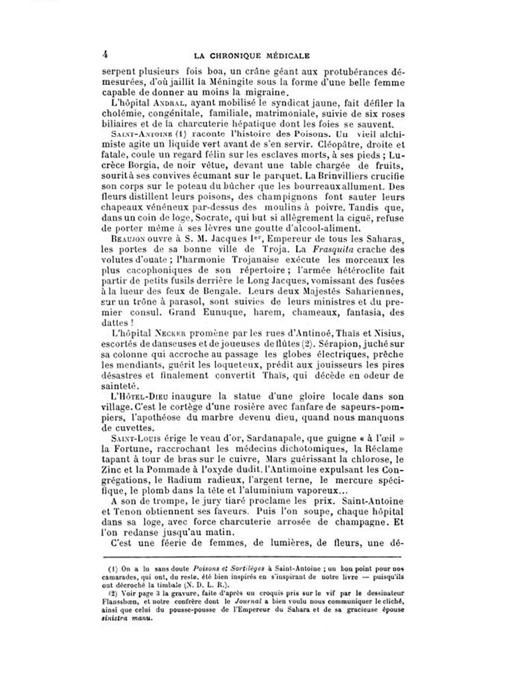Saint Louis érige le veau d'or, Sardanapale, que guigne "à l'oeil" la Fortune, raccrochant les médecins dichotomiques, la Réclame tapant à tour de bras sur le cuivre, Mars guérissant la chlorose, le Zinc et la Pommade à l'oxyde dudit. L'antimoine expulsant les Congrégations, le Radium radieux, l'argent terne, le mercure spécifique, le plomb dans la tète et l'aluminium vaporeux ....