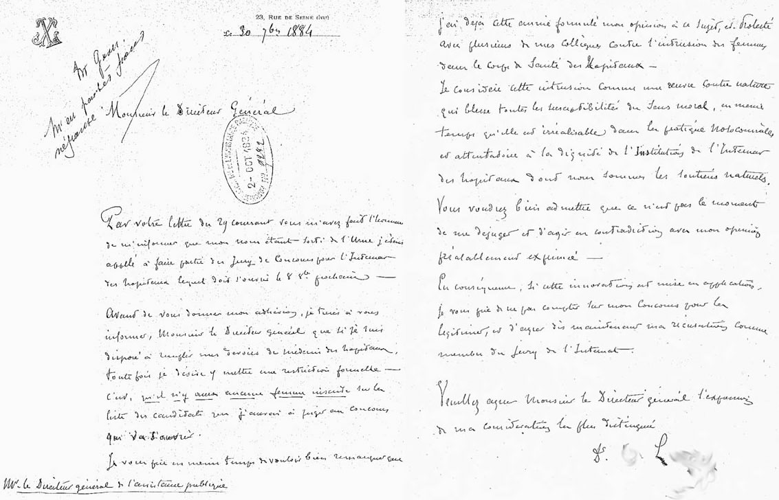 Monsieur le Directeur Général Par votre lettre du 29 courant vous m'avez fait l'honneur de m'informer que mon nom étant sorti de l'urne j'étais appelé à faire partie du Jury de Concours de l'Internat des Hôpitaux lequel doit s'ouvrir le 8 décembre prochain. Avant de vous donner mon adhésion, je tiens à vous informer, Monsieur le Directeur général que si je suis disposé à remplir mes devoirs de médecins des hôpitaux, toutefois je désire y mettre une restriction formelle, c'est qu'il n'y aura aucune femme inscrite sur la liste des candidats que j'aurai à juger au concours qui va s'ouvrir. Je vous prie en même temps de bien vouloir remarquer que j'ai déjà cette année formulé mon opinion à ce sujet, et protesté avec plusieurs de mes collègues contre l'intrusion des femmes, dans le corps de Santé des Hôpitaux. Je considère cette intrusion comme une oeuvre contre nature, qui blesse toutes les susceptibilités du sens moral, en même temps qu'elle est irréalisable dans la pratique nosocomiale et attentatoire à la dignité de l'institution de l'Internat des Hôpitaux dont nous sommes les soutiens naturels. Vous voudrez bien admettre que ce n'est pas le moment de me déjuger et d'agir en contradiction avec mon opinion préalablement exprimée. En conséquence, si cette innovation en application, je vous prie de ne pas compter sur mon concours pour la légitimer, et d'agréer dès maintenant ma récusation comme membre du Jury de l'Internat. Veuillez agréer Monsieur le Directeur Général l'expression de ma considération la plus distinguée. |